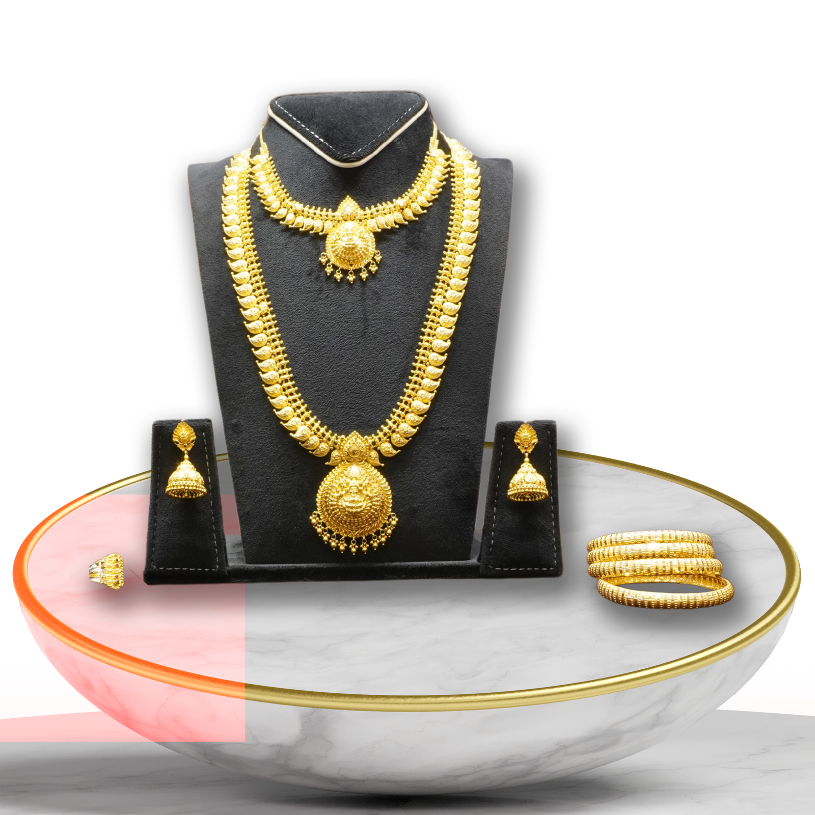 Intricate craftsmanship and polished surfaces define this bridal set, designed for brides who desire elegance with a touch of grandeur. The detailed patterns pair beautifully with traditional wedding attire. Featuring a balanced weight of 127.07 gm, the set exudes luxury and cultural pride, creating an unforgettable impression on your special day.