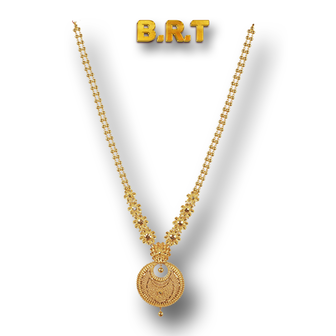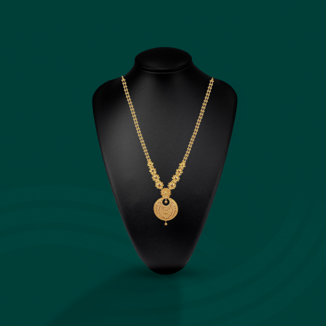 Classic patterns and a brilliant polish define this elegant necklace. Weighing 37.77 gm, it complements your ethnic wardrobe, adding subtle sophistication to festive wear. Whether it's a family gathering or a traditional ceremony, this long necklace brings timeless grace and artistic beauty to your ensemble effortlessly.