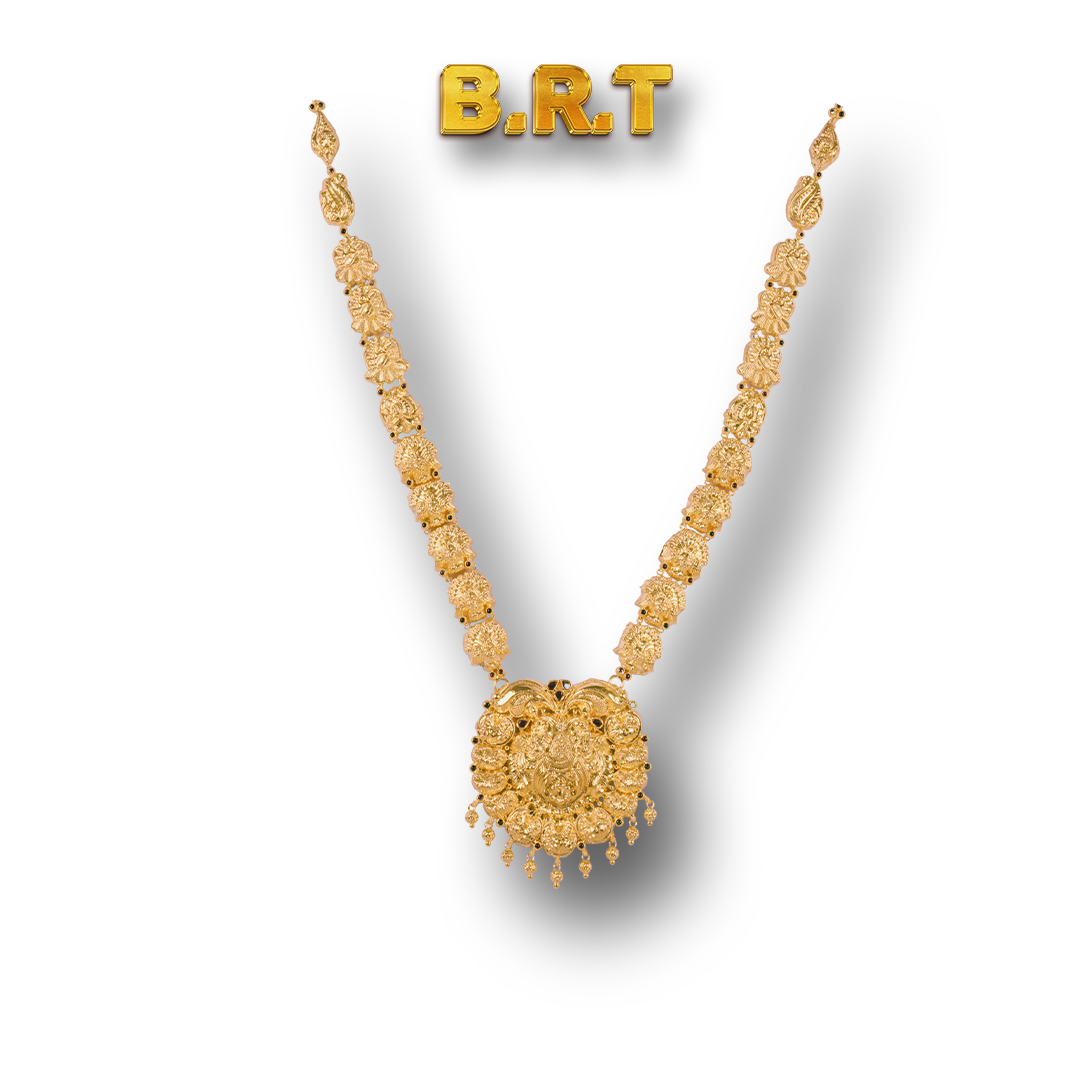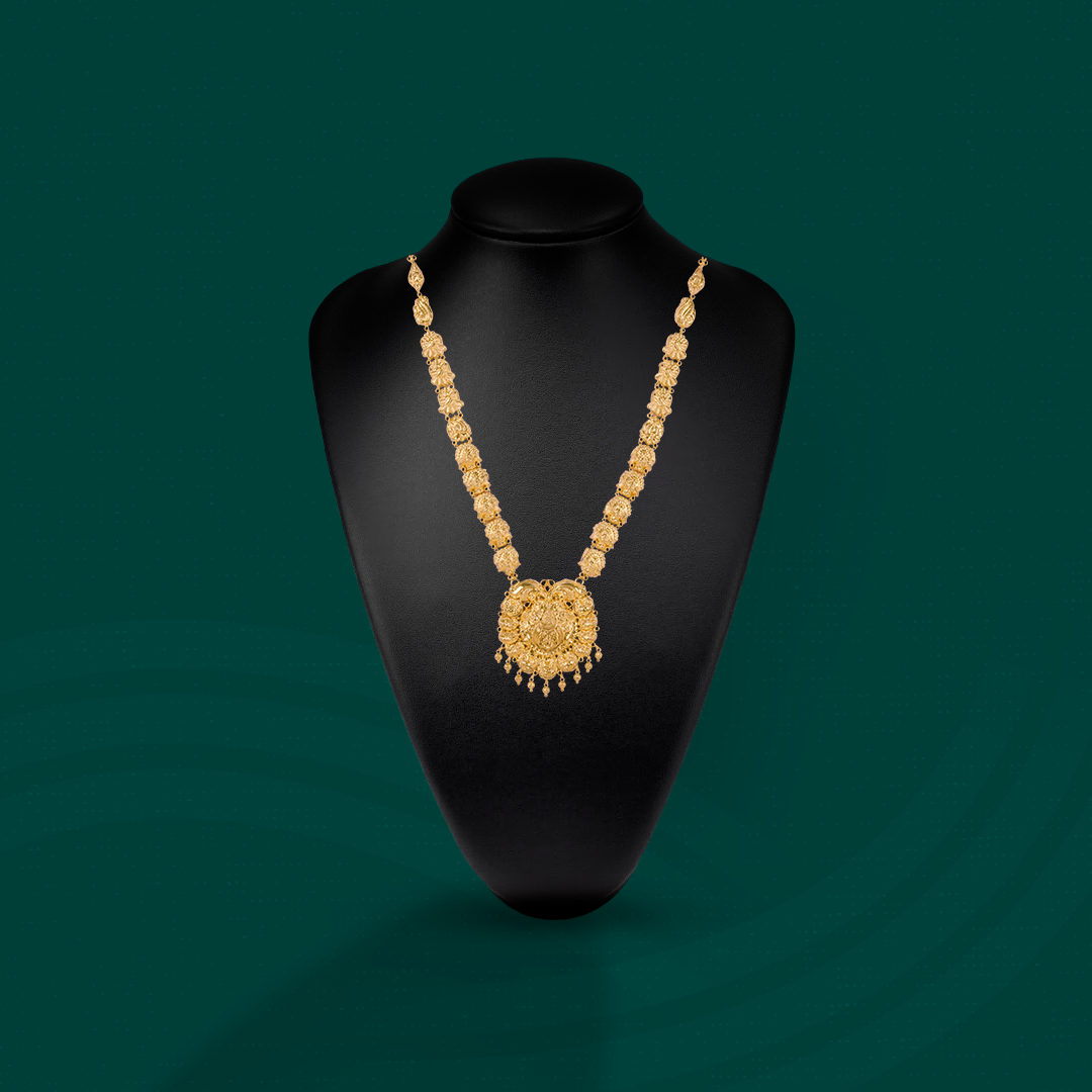 Refined craftsmanship and heritage patterns give this necklace its timeless beauty. Weighing 42.38 gm, it sits gracefully over ethnic attire, making it perfect for brides and festive gatherings. Its polished shine and cultural designs create a look of understated grandeur that enhances every traditional celebration.