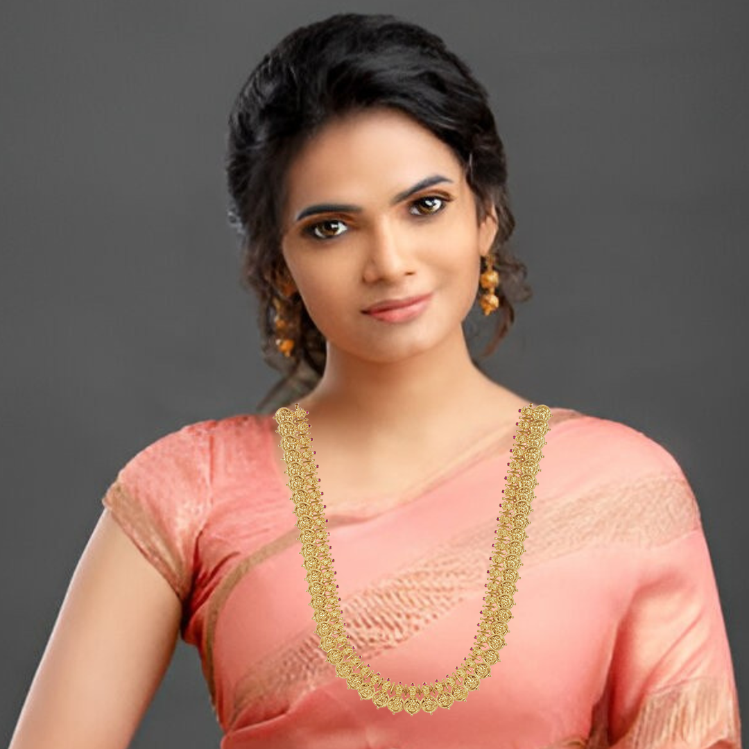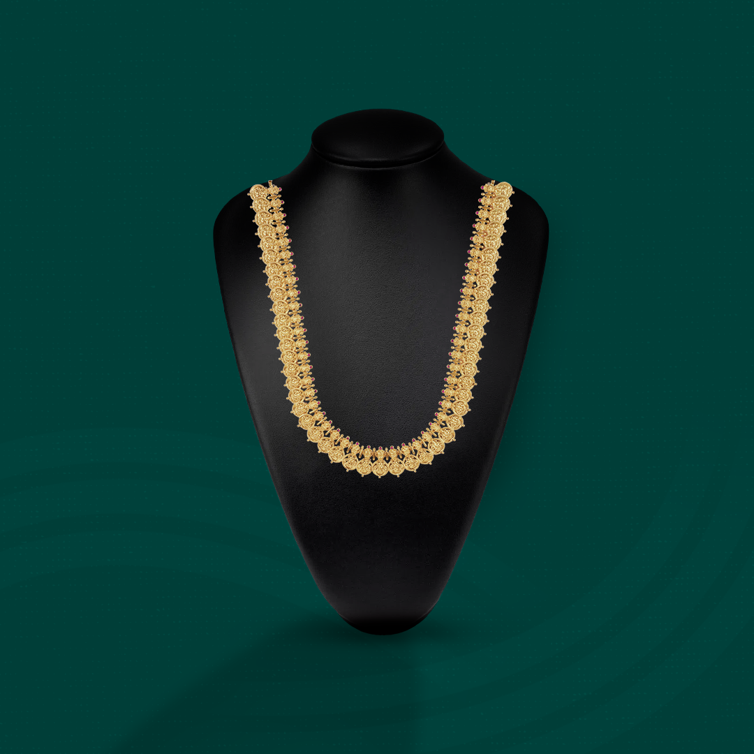 A masterpiece of grandeur, this long necklace showcases exceptional craftsmanship and rich heritage patterns. Weighing 81.67 gm, it transforms your ethnic ensemble into a vision of royalty. Perfect for bridal wear and elaborate celebrations, it offers a timeless blend of elegance, tradition, and luxurious appeal.