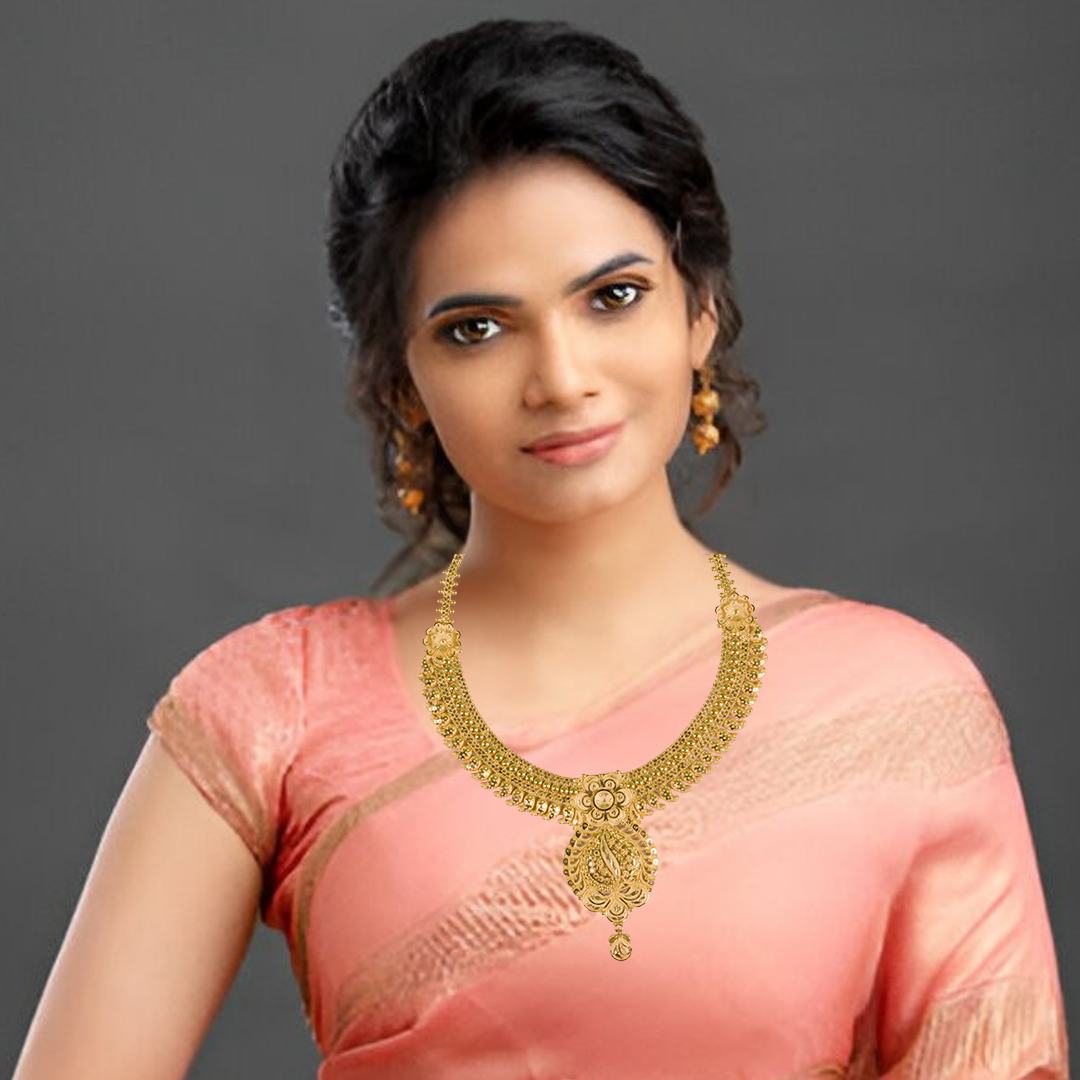 Carefully crafted at 22.66 gm, this short necklace offers refined artistry and a polished finish. A versatile addition to any ethnic wardrobe, elevating both festive outfits and traditional celebrations with graceful charm and intricate patterns.