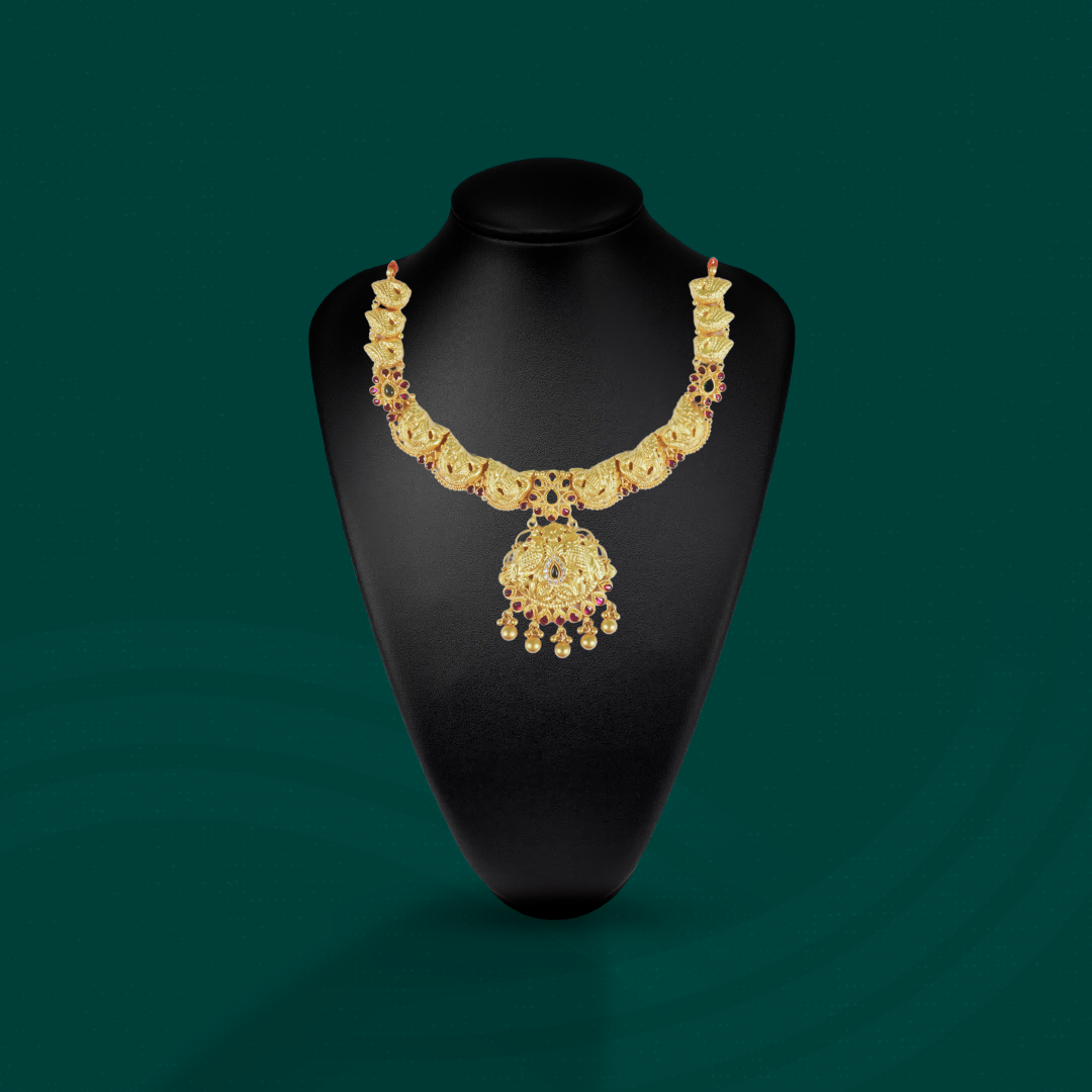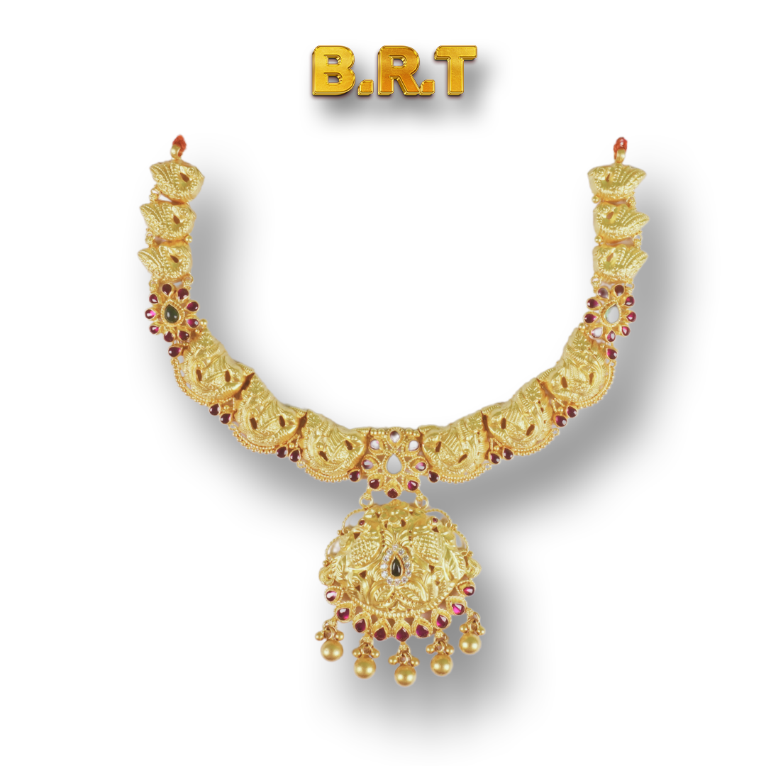 Carrying a luxurious 39 gm, this short necklace brings opulence and tradition together through intricate craftsmanship. An exceptional accessory for bridal attire and grand family gatherings, creating a magnificent ethnic statement piece.